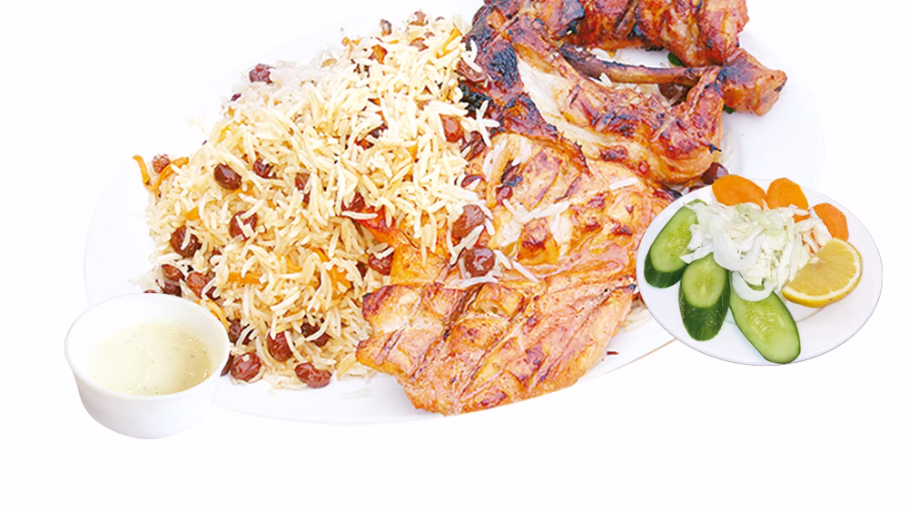 Half chicken charcoal, a perfect meal for one, Afghani cuisine rice infused with carrots and raisins
